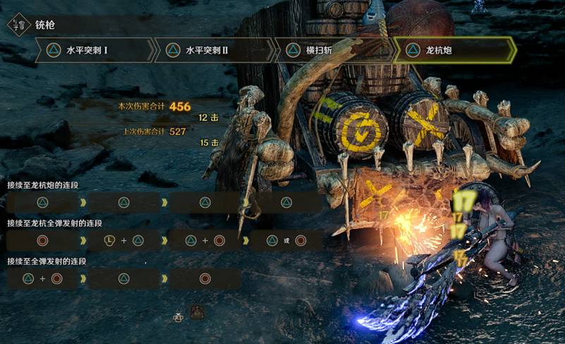 铳枪本作的输出思路就是尽可能的多释放龙击炮,然后用其他攻击充能一直循环。例如开局偷袭,然后蓄力一发龙击炮,接着移动炮击+横扫斩接近怪物,下面给新手推荐几个常用的连招。