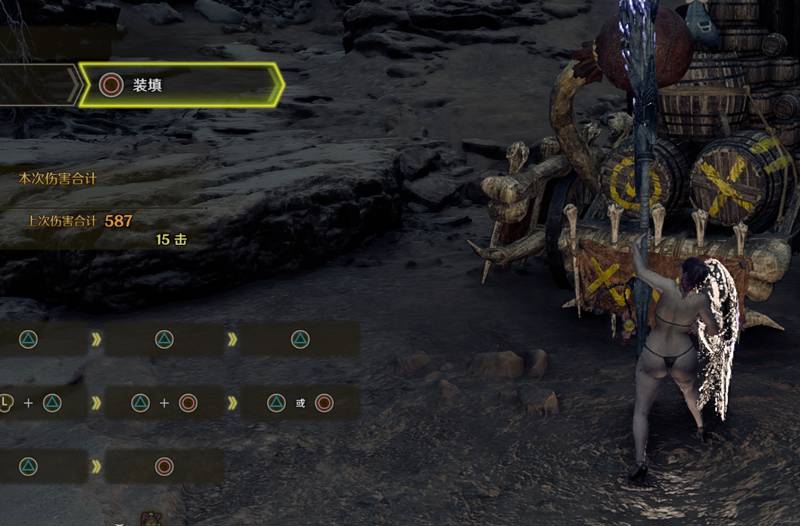 △+○上捞斩,△敲打,○全弹发射,△横扫斩,R2+○快速装弹,而快速装弹还可以再按△派生敲打,之后便可再派生全弹发射形成完美循环。这套连招只消耗普通炮弹,并且可以随时按防打断,在日常打怪中可以作为主力连招。