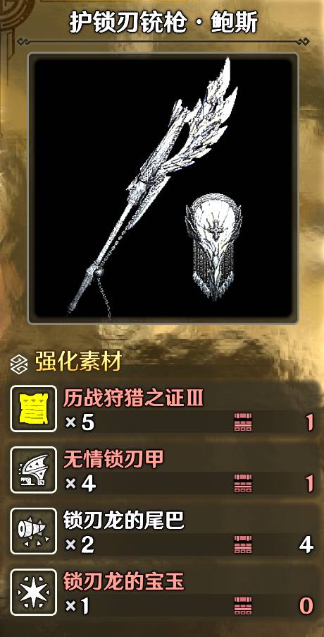 武器选择非常简单,开局捡骨头做骨铳枪,接着做炎尾龙铳枪,从炎尾龙铳枪2级在往下派生做护锁刃龙铳枪,接着一路做到头即可,有追求可以继续打素材研究机械武器。