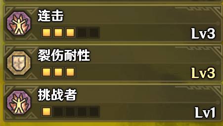 而防具上,如果你和我截图的一样选择,那你可以装上2颗耳塞,3颗逆袭,3级耳塞目前可以无视所有怪物的吼叫,吼叫的时候可以完美打一套长连招,没有的话2级也可以,最少也要2级。逆袭的效果是击飞后增加攻击力,3级实测40秒持续时间加25攻击,很长,只要被怪打飞的伤害就会触发,战斗中故意蹭一下就可以。多余的一个1级孔可以自行搭配。