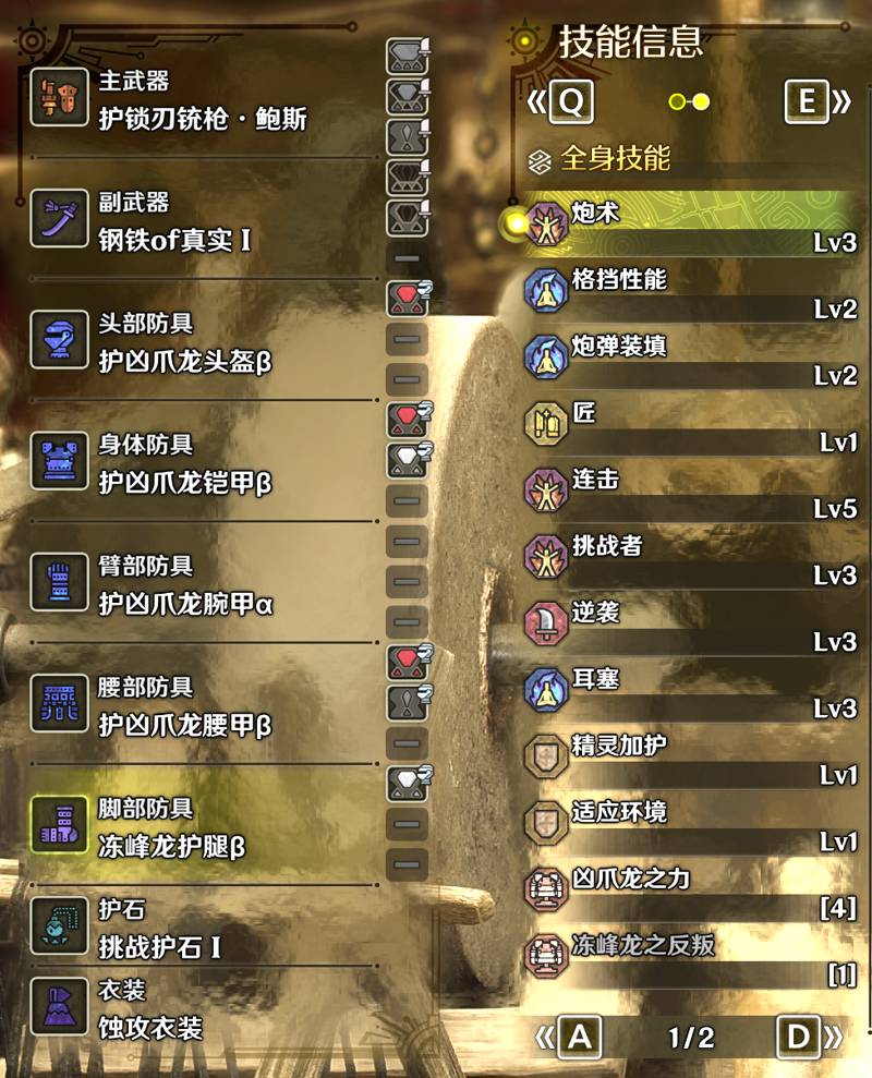铳枪和输出有关的武器技能有炮术,炮弹装填,攻击,攻击守势,护锁刃龙武器需要一颗3级炮术珠,一颗炮弹·格挡性能珠子即可达成3级炮术,2级炮弹装填和3级格挡性能,多余的一颗珠子可以上一个攻击。