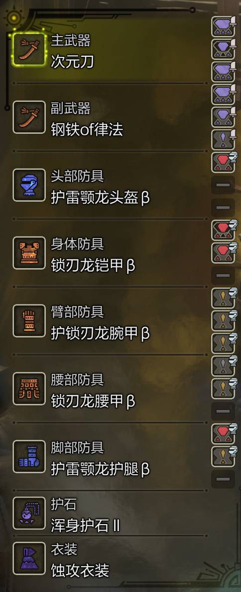 这套装备输出也还算可观,有逆袭3和挑战2,攻击力加成25+8=33。我平时刷锁刃龙失误少六分钟出头,失误多就是七分钟多点,个人感觉挺不错的。
