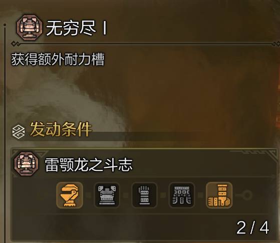 护雷颚龙的套装技能无穷尽,可以给我们提供一段额外耐力,精神抖擞并不会判断这段耐力的消耗。也就是说,只要保证我们的所有行动都不会耗尽这段耐力,就可以实现永续精神抖擞。