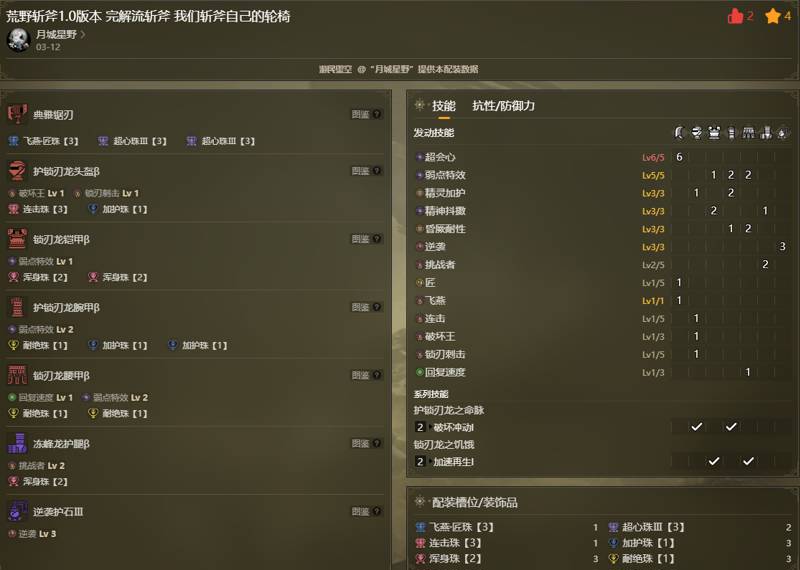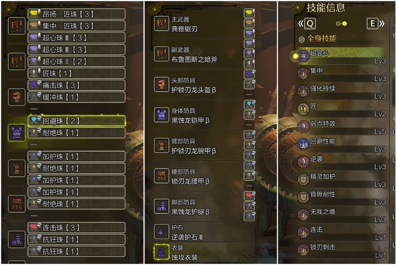 第三套配装的武器与第二套相同,所以我们直接说防具,使用了护锁刃龙与黑蚀龙的两件套,黑蚀龙的效果和第二套相同便不再多说,护锁刃龙则是补充了一点生命恢复的手段,可以弥补gp与相杀的血量消耗,并且同样出了3级的加护和耐厥,还有3级的回避性能增加容错,会心上对比第二套少了挑战者的5点,如果想要满会心也是同样从武器词条上出就行了。