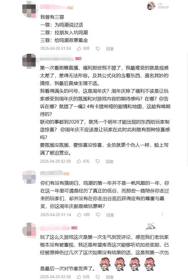 老玩家们自嘲变成“牢”玩家。在1.0开服时一堆雷点(如看板娘秧秧的文案爆典,贬低前线将士的贡献),是老玩家的不离不弃才让《鸣潮》有慢慢变好的机会。结果一周年福利少不说,还区别对待老玩家和新玩家,感到非常不公平。