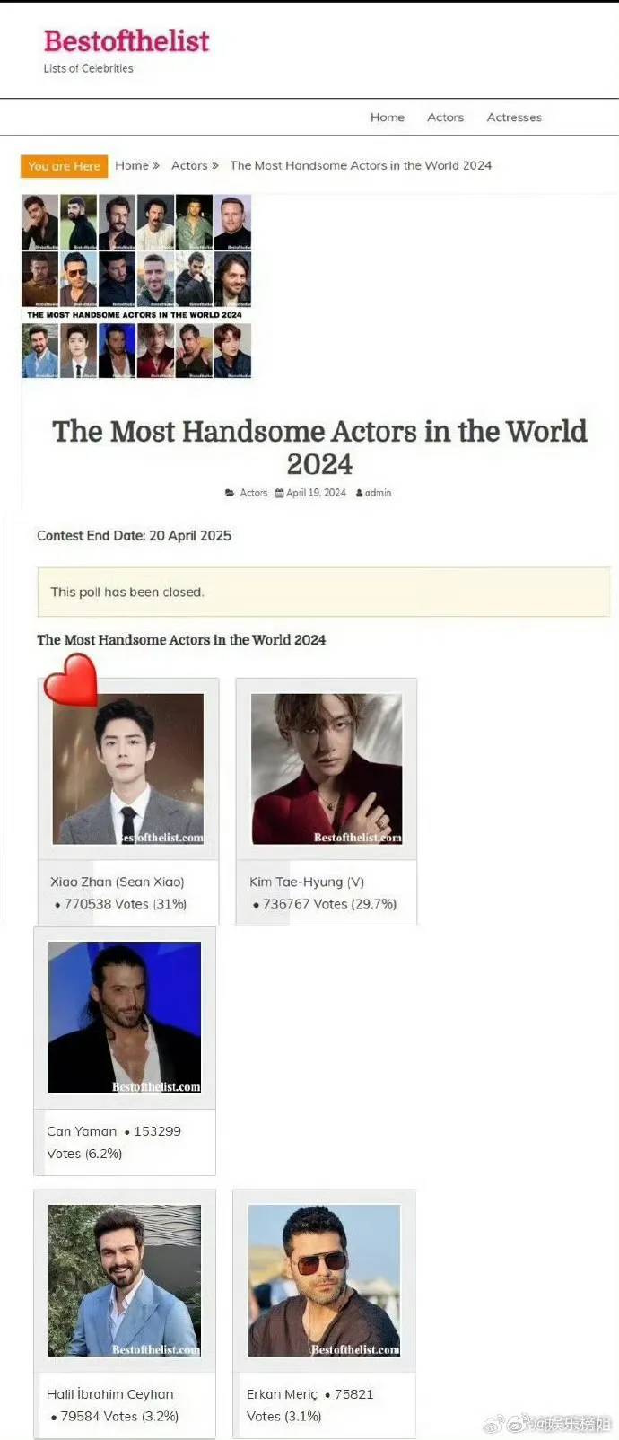 该榜单由网站“Bestofthelist”发起,主要依据全球粉丝投票,综合考量外貌、才华、流行文化影响力及社交媒体数据等因素。
