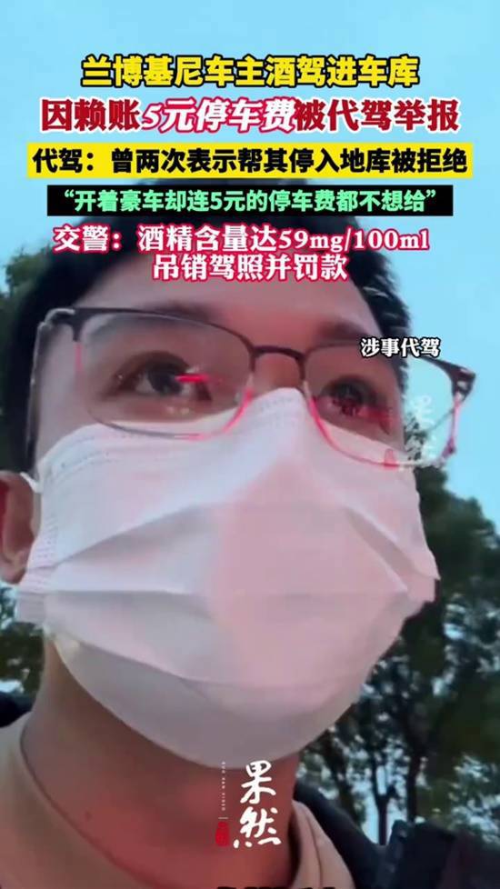 “这个人开着豪车,却连5元的停车费用都不想给,我当时非常生气,马上就报警举报了车主涉嫌酒驾。”代驾小哥说,两名民警很快到了现场,他到车库向民警指证了涉事的兰博基尼车。