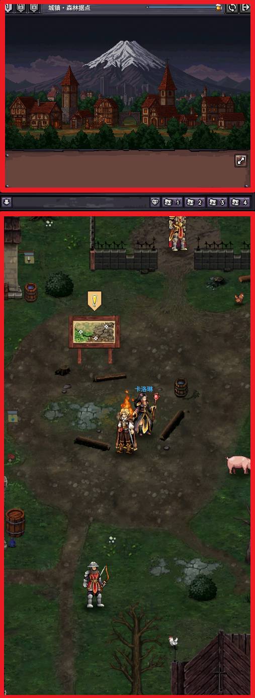 游戏的界面大致分为上下两个窗口,上方的正方形窗口通常展示角色的战斗画面,下方的长方形窗口主要显示地图与各类系统等。