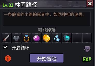 点击地图名称可查看该地图可能掉落的物品,此页面右下角的骷髅头可查看本关卡出没的敌人,左下角红色感叹号可查看本关卡的BUFF,选择开始冒险进入战斗,