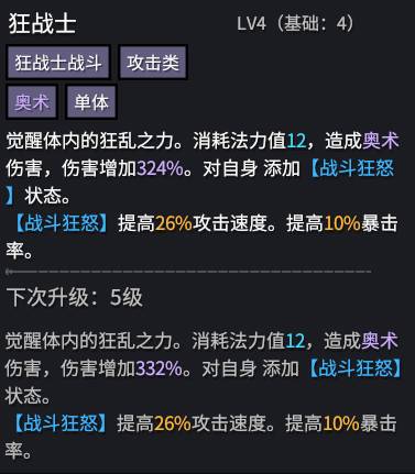 这类技能会随着等级提升百分比,如技能【狂战士】每升一级都会提升8%,所有技能的伤害成长数值都是固定的。