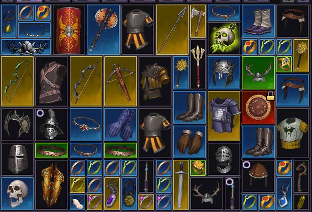 本作中的所有装备都被分为七个品质,从低到高依次为:普通(黑)、精良(浅蓝)、魔法(深蓝)、稀有(黄)、套装(绿)、传奇(红)、手工(橙)。