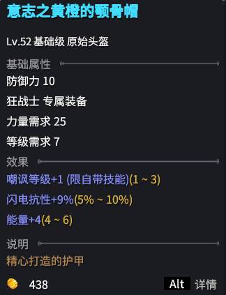 前缀和后缀都会为装备提供词条效果,【意志之】为这件装备提供了【能量+4】的效果,【黄橙的】为这件装备提供了【闪电抗性+9%】的效果。