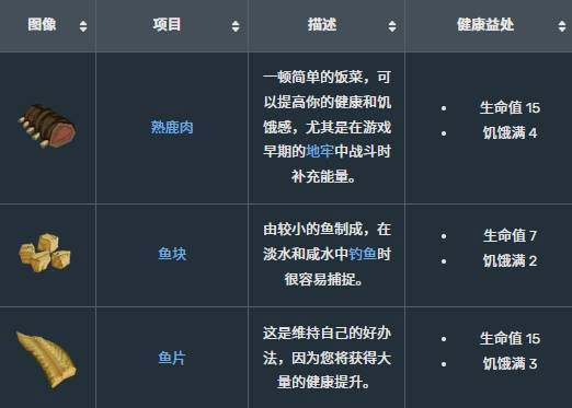 篝火可以简单处理肉类,烹饪出以下3种食物,说是3种实际上就是各种鱼和肉丢进篝火里烤烤就产出了。前期烤烤肉当做下地牢的补给品很不错,能够直接回复一些血。