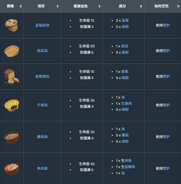 用壁炉可以深加工各种食材,属性普遍很好但是你开局是做不出来壁炉的,壁炉可以烹饪出以下6种食物。