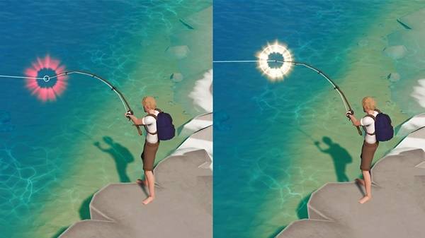 当你看到浮标被拉动时,点一下鼠标开始钓鱼的互动,出白圈就点鼠标,出红圈不要点否则鱼就跑了,白圈成功互动几次鱼就钓上来了。