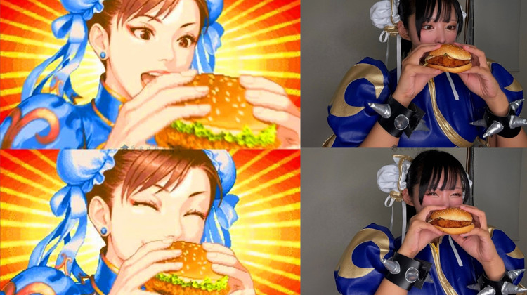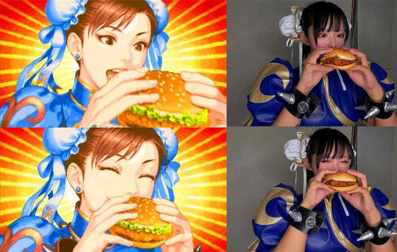凭借着一组“春丽在料理店打工”的主题作品,“kimimo_purin”打响了知名度,受到了许多网友的喜爱!不过人红了,粉丝多了,就有了被“催更”的压力,后续麦当劳居然送上了素材,他们与《街头霸王》联动,以复古像素艺术风格进行宣传,里面有春丽啃汉堡的画面。不需要什么成本投入,小姐姐只要买个汉堡吃吃,就是一个优质的Cosplay作品,玩得还挺6!