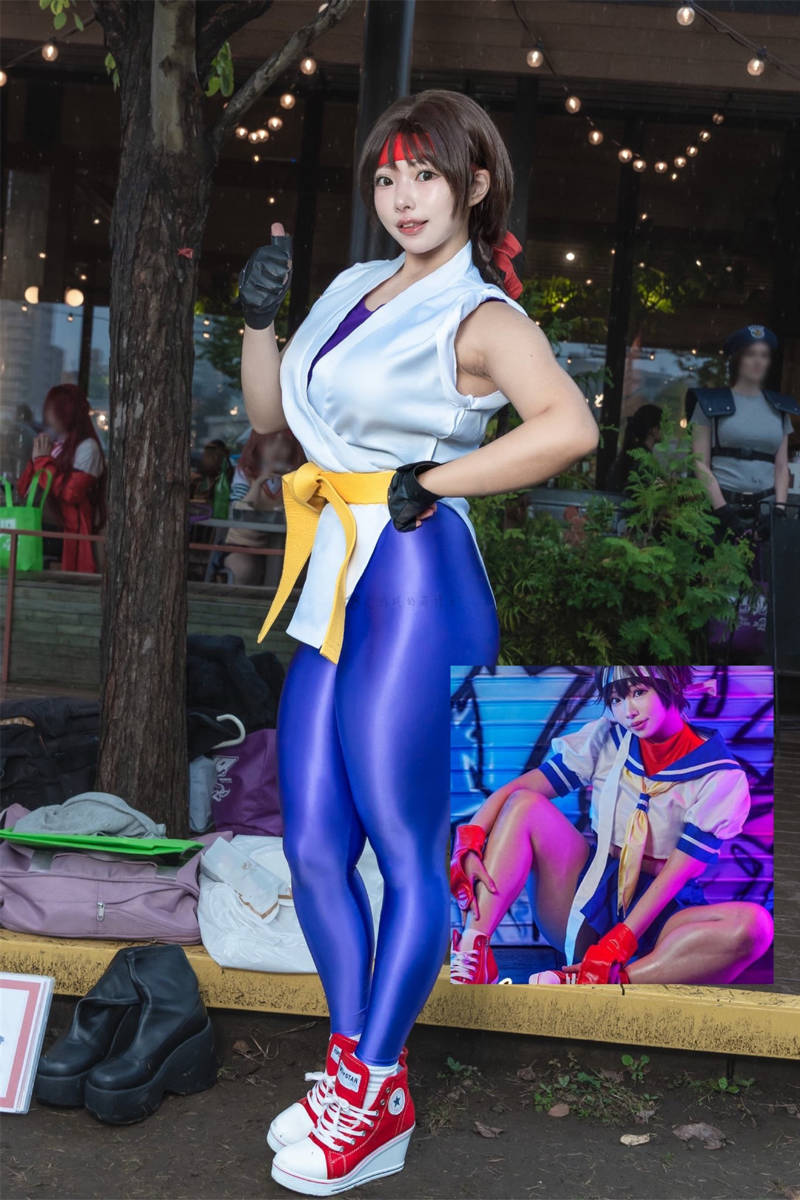 妹子对于衣着、道具的选择相当聪明,在尽可能还原坂崎百合造型的同时凸显自己的优势,比如:那条紧身裤勾勒出蜜大腿的魅力线条;红鞋子的跟还挺高,弥补一下本人身高的缺陷。所谓一招鲜吃遍天,有这么一对腿,扮演起那些格斗游戏里的女角色,应该都能游刃有余。果不其然,后续,她又Cos了《街头霸王》春日野樱等。