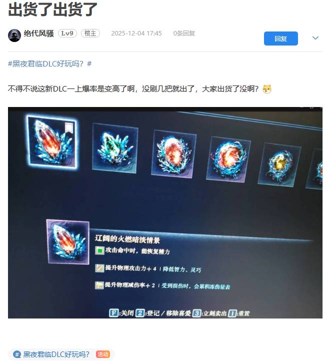 在话题#黑夜君临DLC好玩吗?#下发帖,聊聊您的游戏日常、DLC游玩体验,即视为参与活动