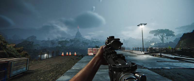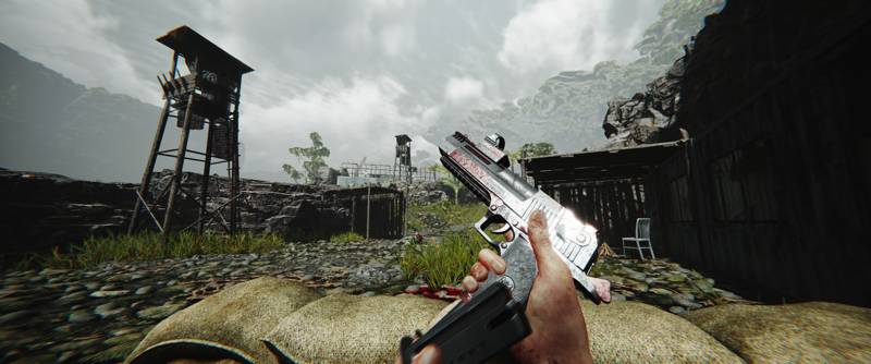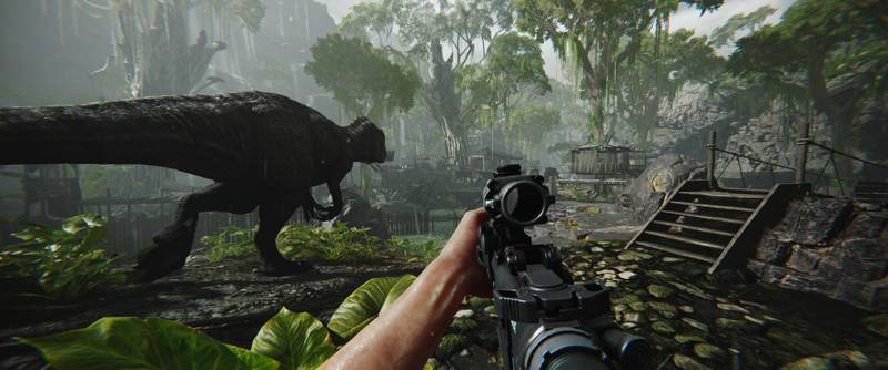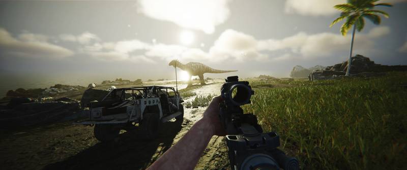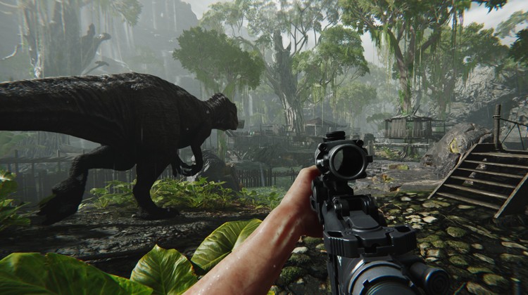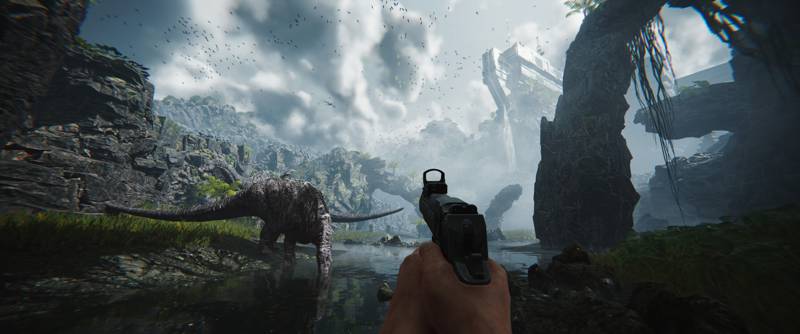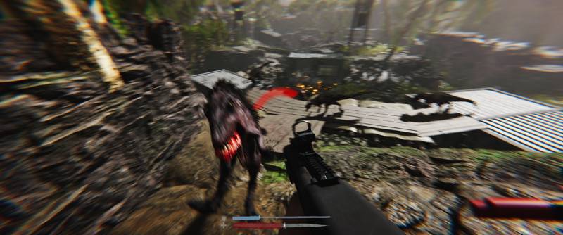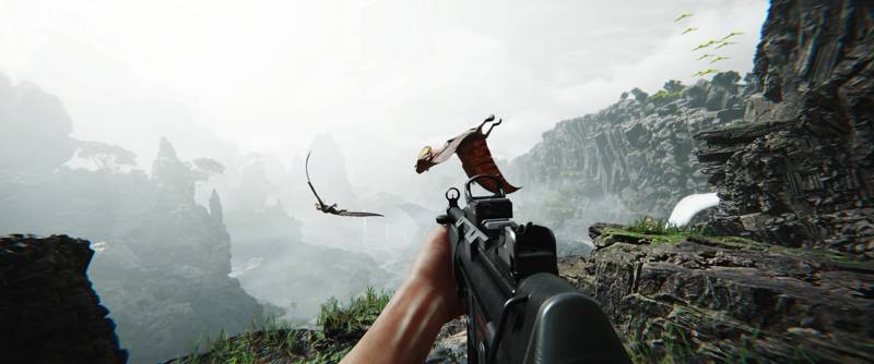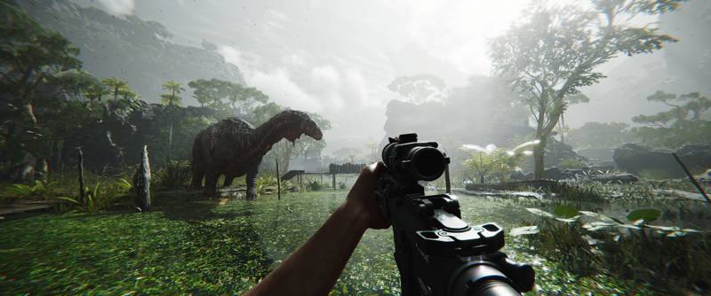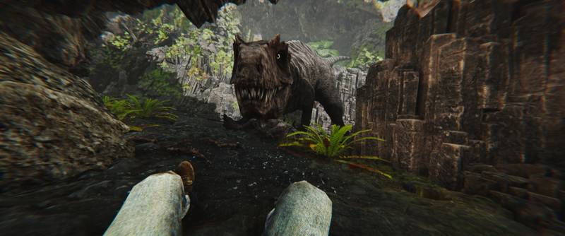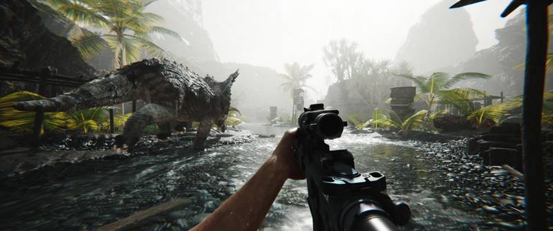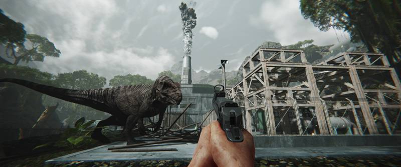 本作的战斗体验不错,枪械手感有些类似《Bodycam》,比较偏写实,且敌人中弹后的表现也十分到位。游戏里的TTK比较短,敌人中弹后会倒地呻吟,而沙漠之鹰或狙击步枪等大口径武器则可以直接将敌人的手臂或腿打断,血腥程度可见一斑。有趣的是流程早期玩家就会得到可以指引恐龙的装备,三角龙的冲撞、霸王龙的撕咬可以直接将敌人肢解,霸王龙甚至可以直接把敌人上半身咬断吞掉,进一步加强了恐龙的压迫感。
