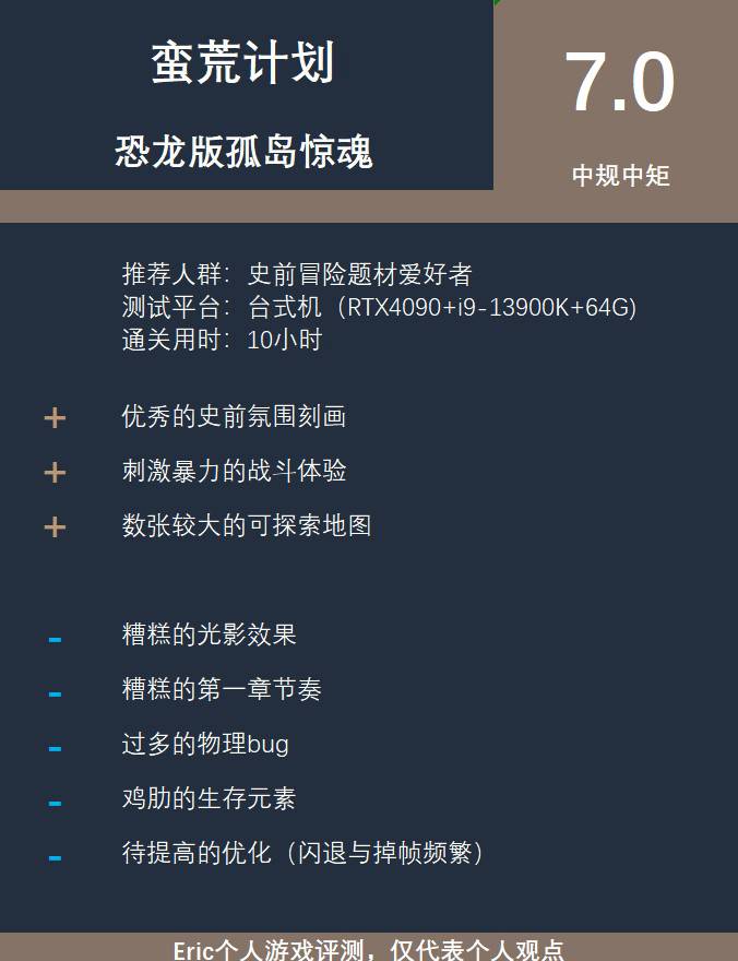 个人给予这部作品7.0/10分,属于“中规中矩”的范畴。这是一部在史前时代冒险的单人FPS作品,氛围和战斗都不错,但众多的bug和糟糕的开头章节让很多玩家都在半小时左右弃坑,并在Steam上留下了差评。个人用10小时通关了本作,发现若熬过了开头的半小时,后续体验提升很明显,整体算是差强人意的。