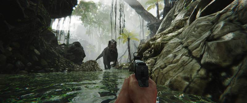 我从小就爱看《侏罗纪公园》系列,后来的《侏罗纪世界》系列也一部都没落下,在原始丛林对抗恐龙的梦想一直在心头徘徊。有授权的《侏罗纪世界》游戏大部分是模拟经营类的造公园游戏,本作才让我真正体验了以第一人称视角深入密林的冒险。这部作品竟然用Unity引擎给玩家们塑造了这个高沉浸感的史前世界,天上成群飞鸟、略有雾气的林间、奇形怪状的山峰与植被共同营造了生动的原始丛林。游戏流程穿过了几个白天黑夜,白天的霸王龙震撼感十足,夜晚的丛林中迅猛龙也能令玩家胆寒。