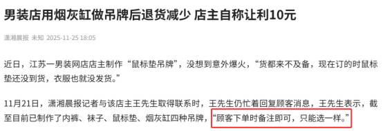江苏一男装店店主为防止恶意退货,推出了鼠标垫、内裤、烟灰缸等多种样式的‘吊牌’