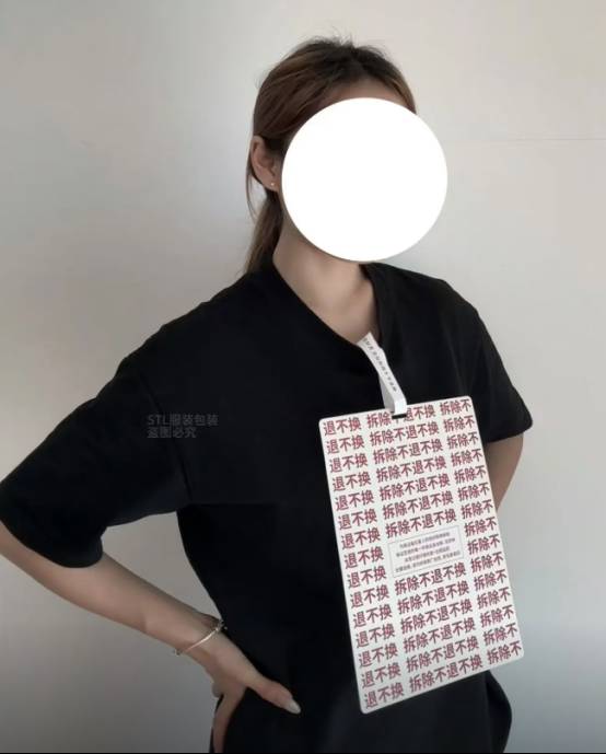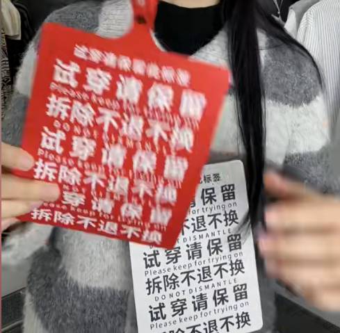 而巨型吊牌的好处,就是收到货的发现不合身,货不对板,料子不如预期等等情况,依旧可以正常去无理由退货,主打的就是一个别想再穿着这件衣服出去白嫖,美美拍照后再退货。