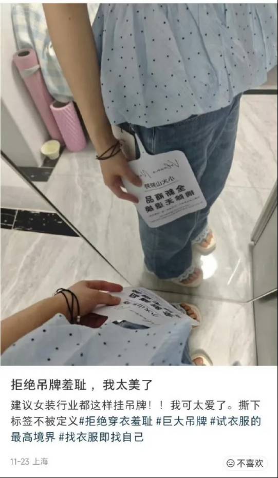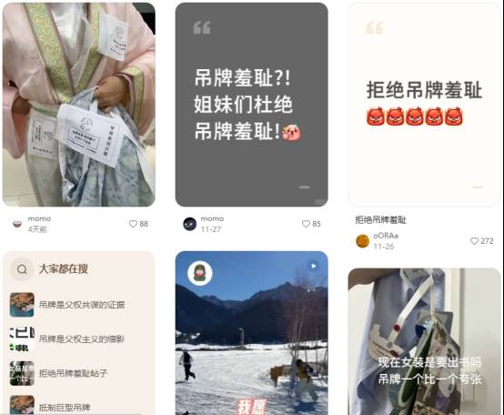 能够做出以上这些行为的,就不难理解为什么某平台上突然就出现所谓“拒绝吊牌羞耻”、“巨型吊牌是父权主义”的帖子了。