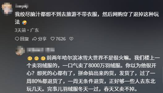 小到幼儿园文艺汇演买演出服洗都不洗一身臭汗直接寄回,大到高价羽绒服寄到景区旅游穿完一身脏污无理由退货,不仅白嫖好几天免费新衣服还不用洗,有这脑子用在正道上好不好啊。