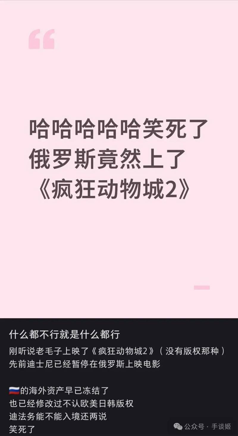 然而在这种环境下,俄罗斯却和其他国家与地区一样,顺利地上映了《疯狂动物城2》。
