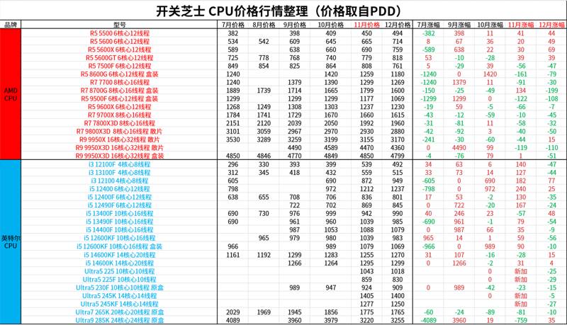 得,还得是自己当牛做马,12月CPU推荐倾情奉上,首先是价格行情整理: