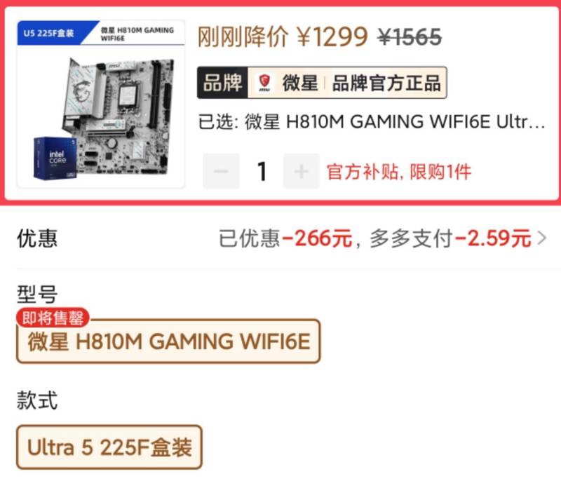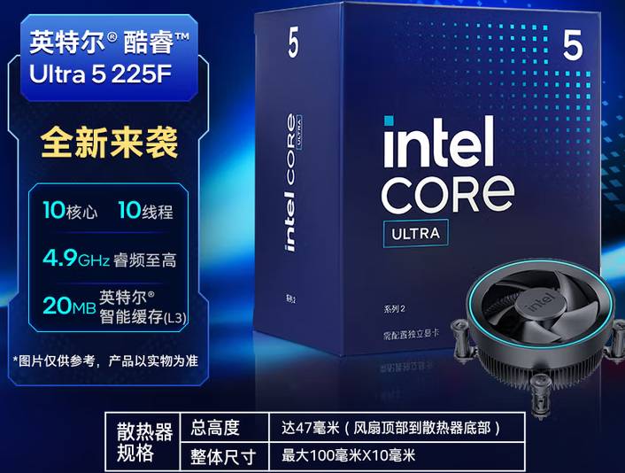 由于功耗发热低,H810等入门主板就能带动,甚至盒装的CPU都能压住U5 225F,搭配主板买套装可获得更高性价比!