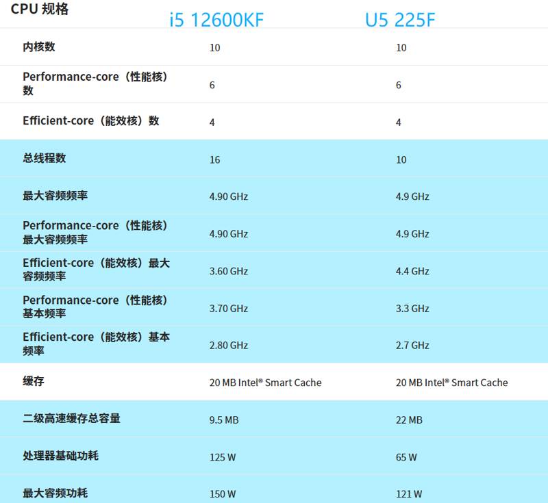 若不打算未来升级,准备一套换新,那12600KF是更好选择。若是想战未来换新U,那可以考虑U5 225FU5 230F 10核心10线程(约909元,建议搭配H810、B860主板)
