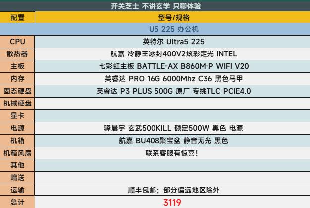 此外可以考虑U5 225,没有F后缀,意为带核显。可以不用加装独立显卡就能直接亮机,很适合搭设入门核显办公整机: