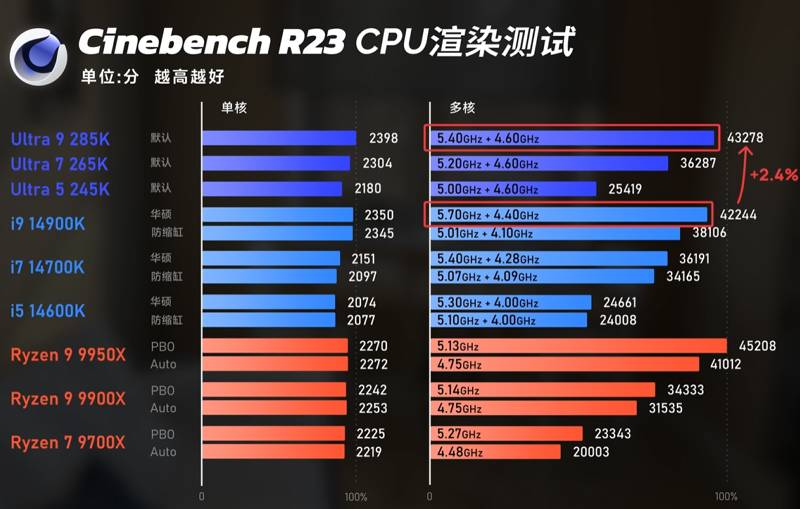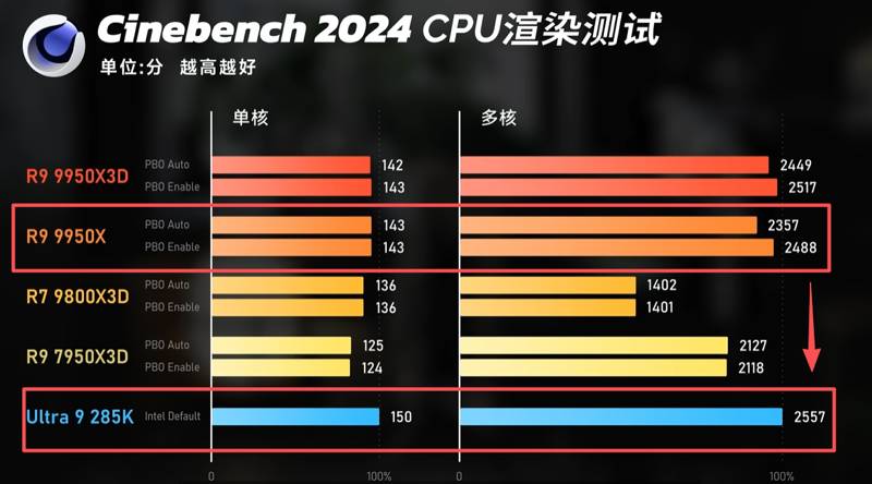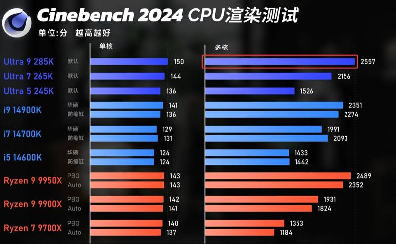 生产力性能和英特尔旗舰U9 285K(约3255元)相近,适用跑重度渲染、专业生产力的工作人群: