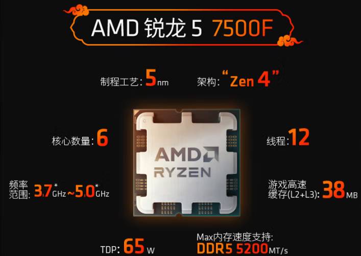 5600GT核显性能接近独显GTX750TI,可1080P低中画质、游玩腾讯网游全家桶(如LOL、CF、DNF等)R5 7500F6核心12线程(约761元,建议搭配A620/B650主板):