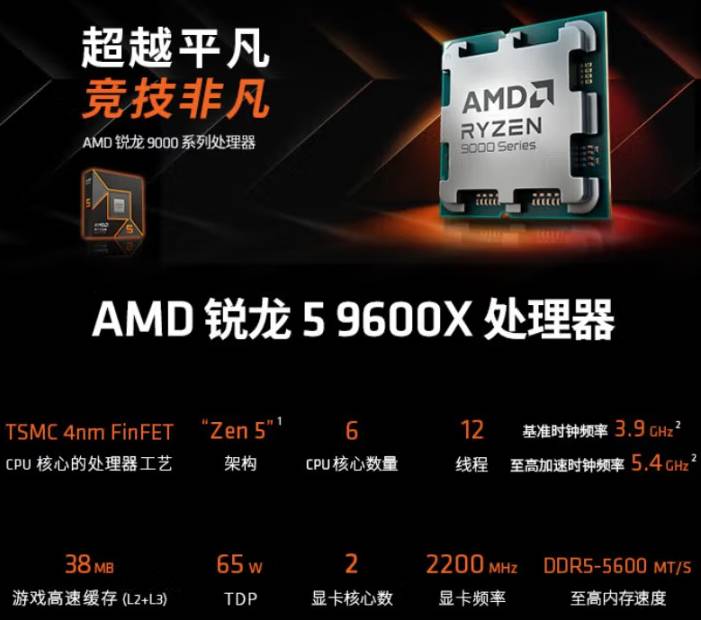 还有个降频版本的R5 7400F,频率比7500F低0.3Ghz,但价格没便宜多少、温度也高,浪费沙子并不推荐R5 9600X6核心12线程(约1230元,建议搭配B650主板):