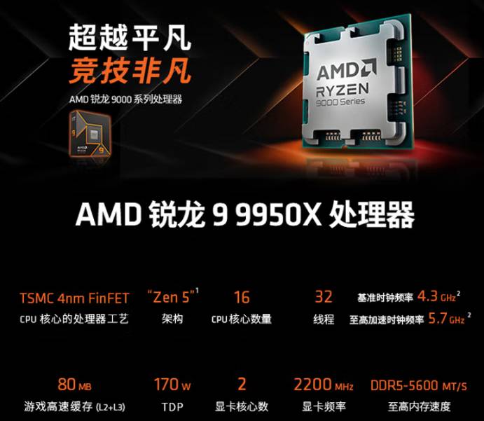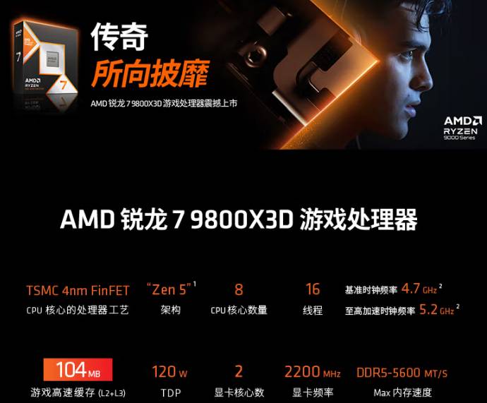 注:若只玩游戏,R5 7500F、R5 9600X甚至R5 5600这种级别的CPU就完全足够,多花钱上R7的提升不大R7 9800X3D8核心16线程(约2880元,建议搭配B650/B850/X870E主板):
