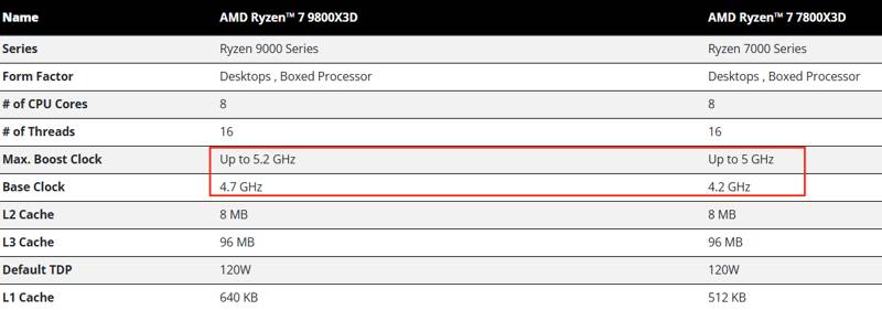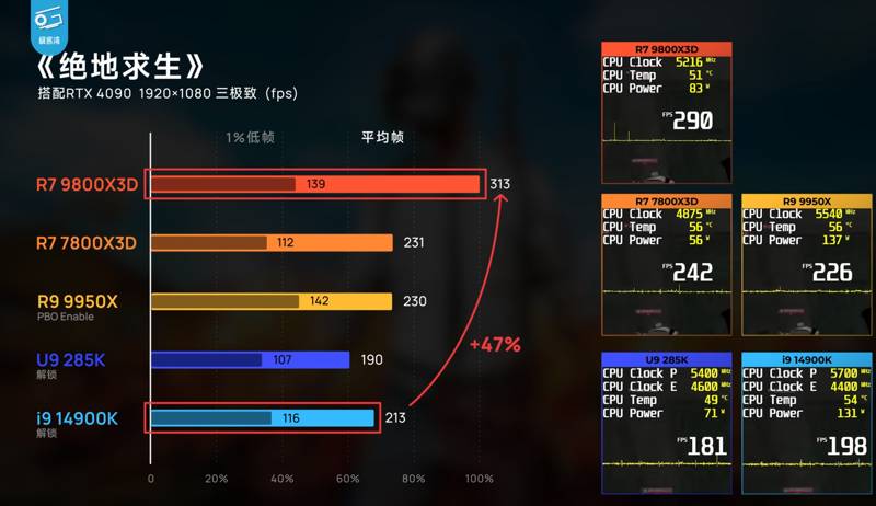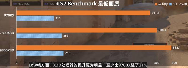 同样得益于架构、工艺的优化,9800X3D的发热功耗比7800X3D更低、也就支持更高频率和超频!综合游戏性能就更强:
