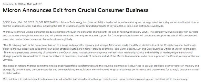 12 月 4 日,美光科技正式发布声明,旗下拥有 29 年历史的消费级品牌 “英睿达(Crucial)” 将彻底退出市场。作为全球第三大内存厂商,美光与三星、SK 海力士联手垄断了 92% 的全球内存市场,这次主动离场直接在消费级存储市场撕开一道供应缺口,让本就深陷涨价潮的 PC 玩家们雪上加霜。