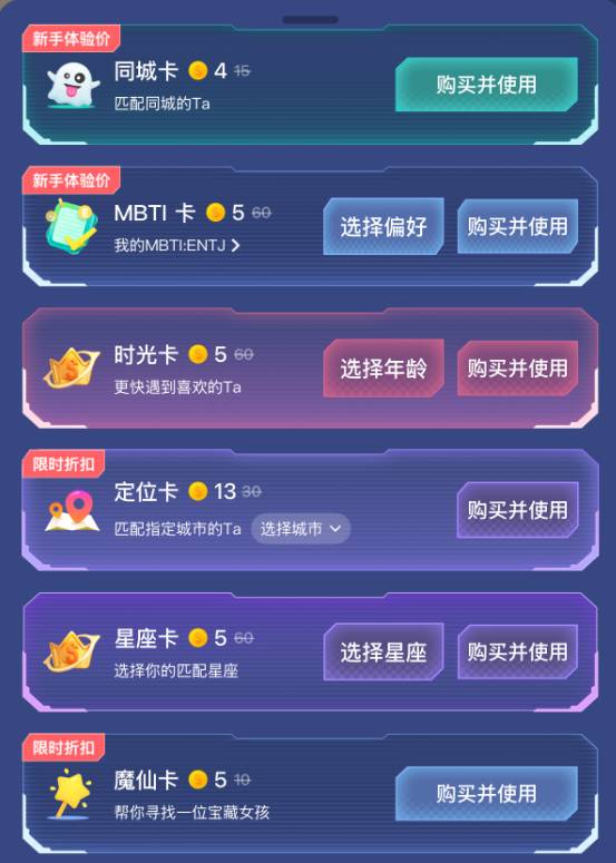 虽然能免费用,但想要提高匹配概率,找到更称心如意的人,就需要卖额外的道具卡。而且,免费也有次数限制,很多功能一天只能用 12 次。