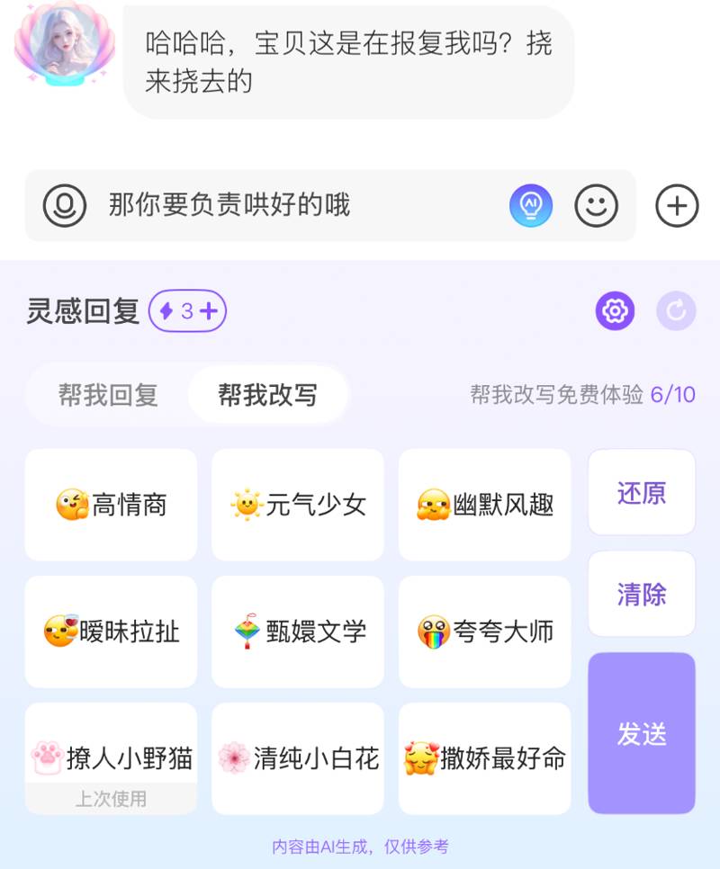 比如说,AI 能当你的僚机。Soul 自研的 SoulX 与 AI 驱动系统,不仅可以帮你匹配更适合的人,还可以自动推送回复,润色你的话,帮不会聊天的你征服对方。