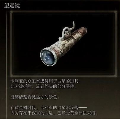 而道具望远镜中则清楚的写道,“在黄金树时代,卡利亚的占星术没落,因为存在于夜空的命运,已经受黄金律法束缚”。换句话来说,在黄金树能源衰落的现在,夜晚已经无法再被黄金树支配。