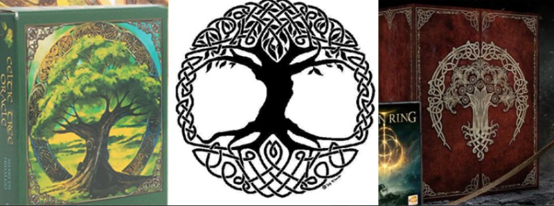黄金树是《艾尔登法环》掌管生死轮回与力量赋予的存在,围绕其产生了女王、半神、以及相关宗教,而黄金树的纹章大概是借鉴了凯尔特神话中的生命之树图案,整体的设计形象都比较近似。