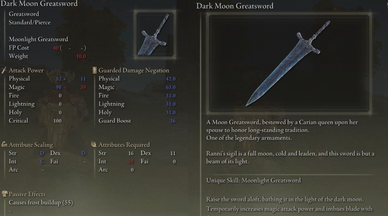 《艾尔登法环》玩家也可以装备“月光大剑”,需要在蕾娜的剧情线中获得。武器介绍为“卡利亚女王赠与配偶的武器“,明媒正娶了属于是。