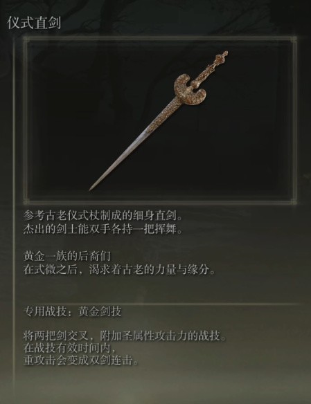 参考古老仪式杖制成的细身直剑。杰出的剑士能双手各持一把挥舞。黄金一族的后裔们在式微之后,渴求着古老的力量与缘分。
