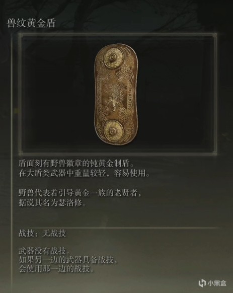 盾面刻有野兽徽章的钝黄金制盾。在大盾类武器中重量较轻,容易使用。野兽代表着引导黄金一族的老贤者,据说其名为瑟洛修。