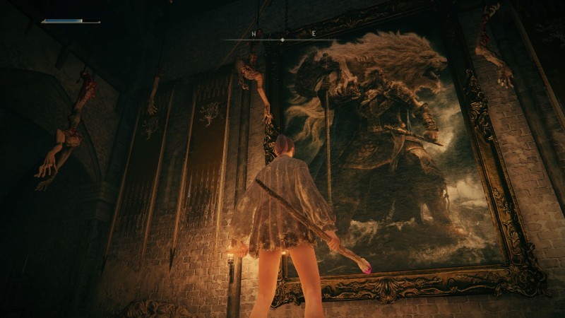 大厅的墙上有着一幅壁画,上面是一位手持巨幅的王者,一头白色的狮子趴在他肩头,王霸之气与此处亵渎的场景显得格格不入。褪色者猜想此处原本应是一处宴会厅吧,王者与凯旋的将士们欢聚一堂,而此时被变成了这种炼狱。