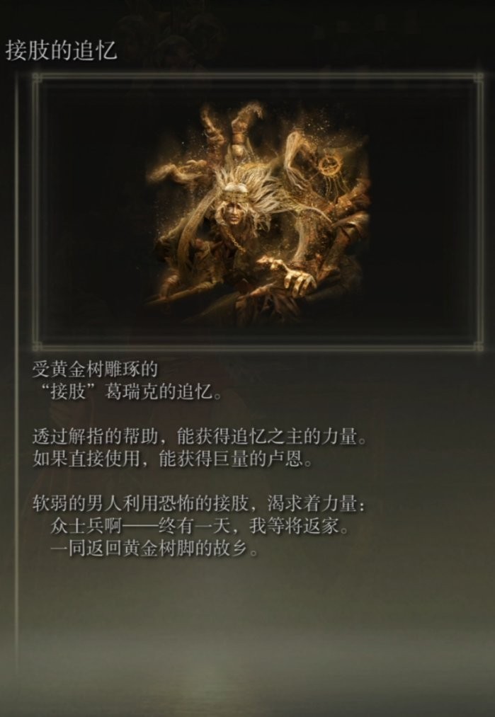 前往了史东薇尔城的庶出众人被葛瑞克“接肢”,并非是受到强迫,而更像是一种自我牺牲,因为葛瑞克毕竟是正统的“黄金君王”,但因自身实力拉胯,只能通过“接肢”这种手段变强,他的最终追求不过也只是返回王城,而“接肢的追忆”也说明了这一点:
