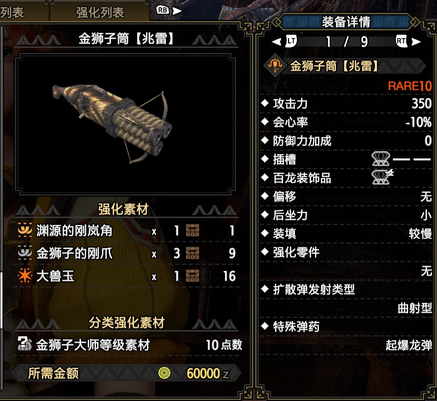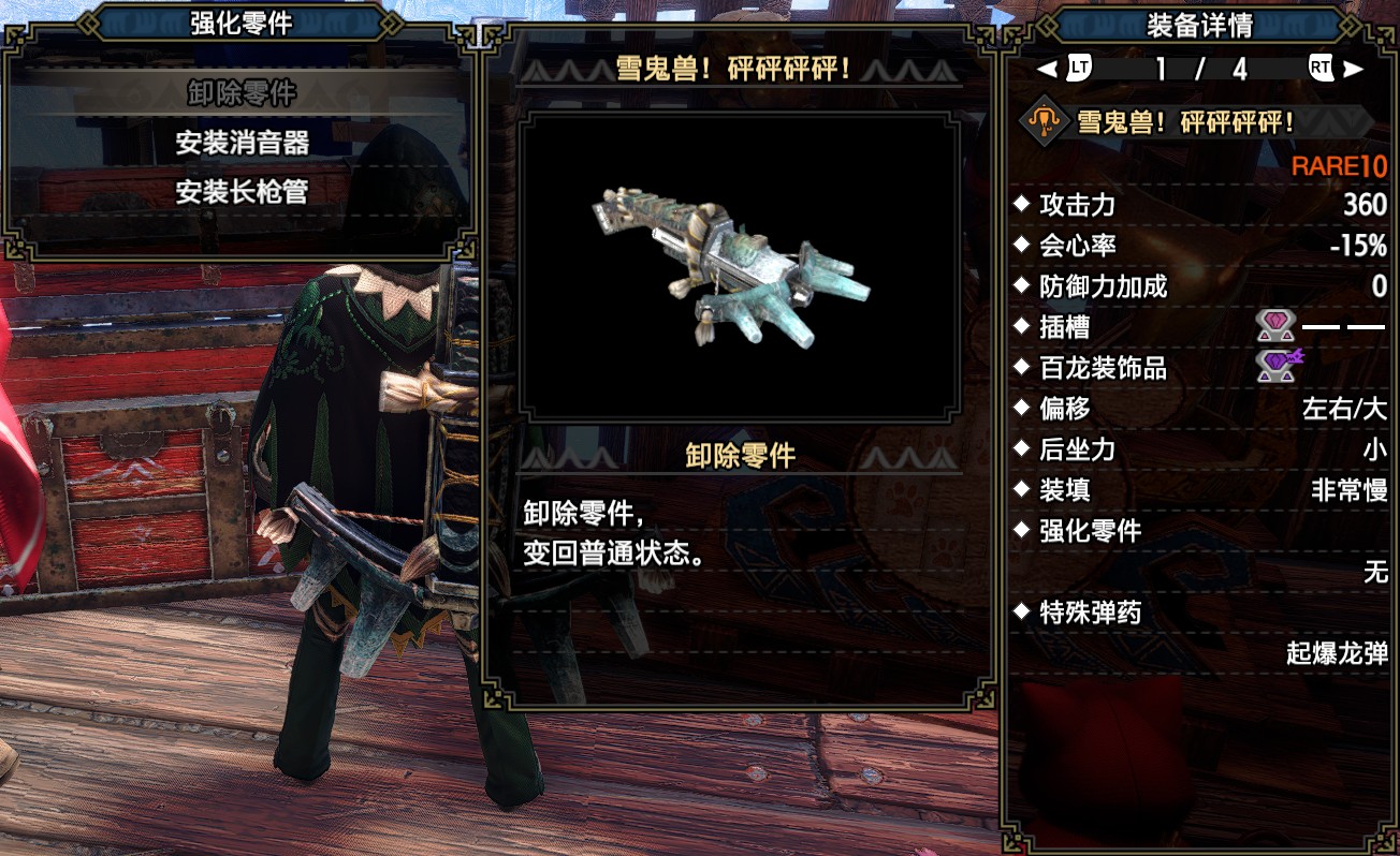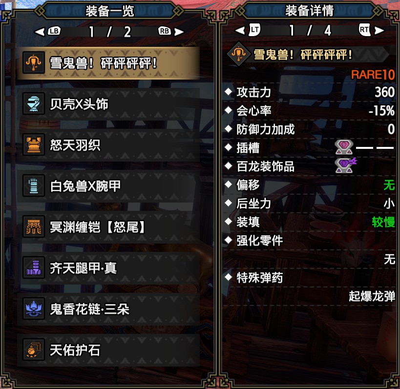 接下来说下配装思路,看破5的25%+弱点特效3的50%+精神抖擞2的20%+力量解放1的10%-武器自带负会心15%=有效部位90%会心。速射强化+连击+超会心可以有效的保障伤害,而回避距离提升1和弹道强化2让整个狩猎过程安全性高出很多。伤害很给力,谁用谁知道!